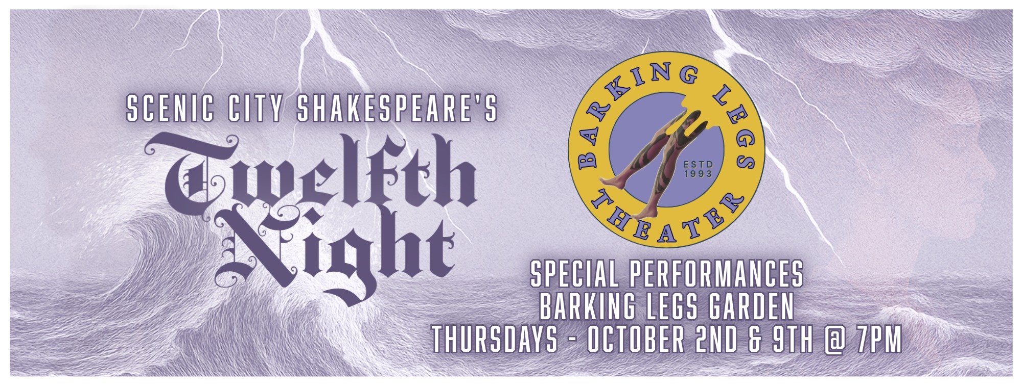 Scenic City Shakespeare is thrilled to add two Special Thursday Night performances in the Garden at Barking Legs Theatre. Join us October 2nd and 9th for Twelfth Night!